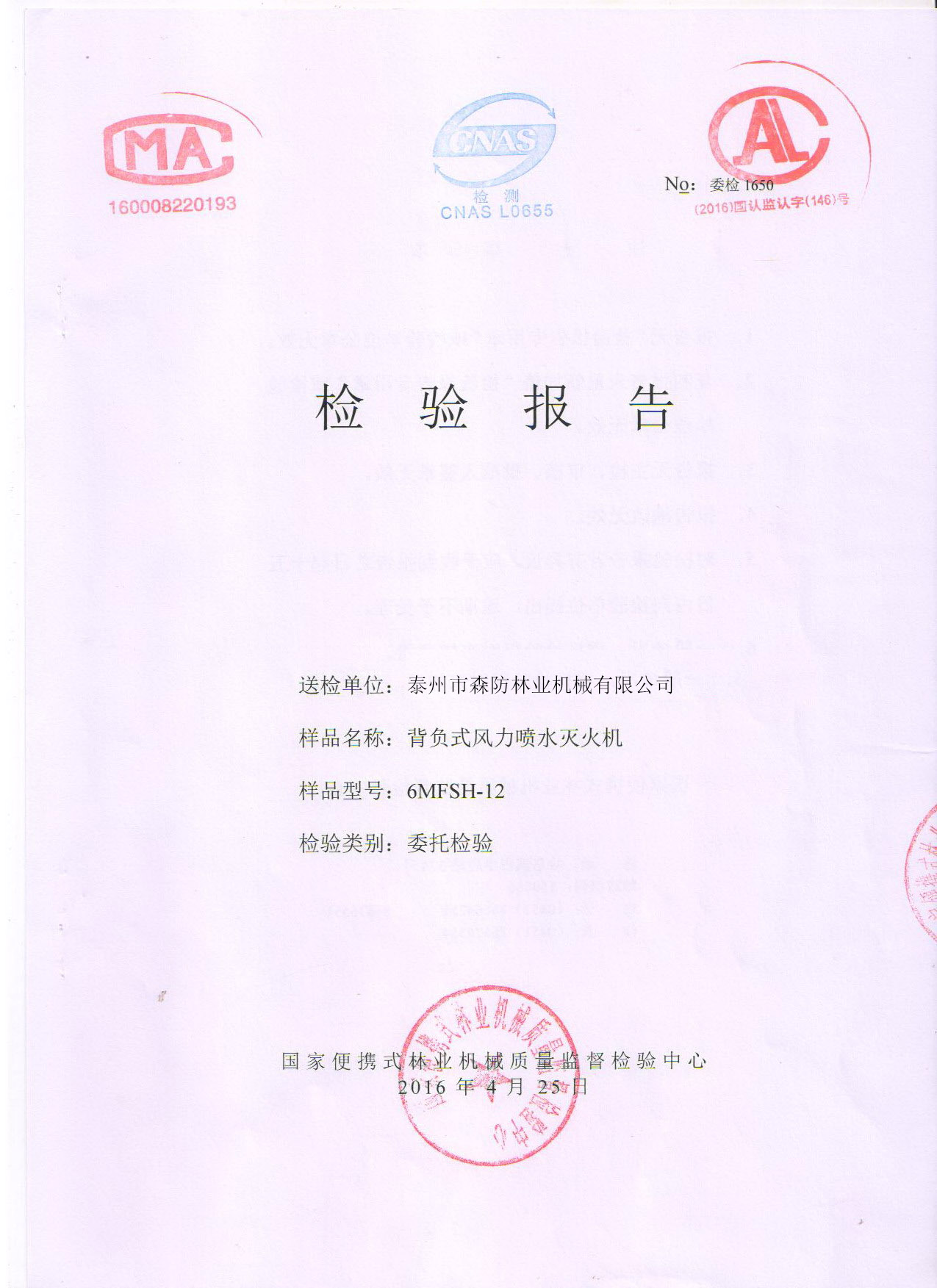 背负式风力喷水灭火机检验报告